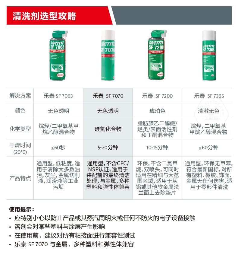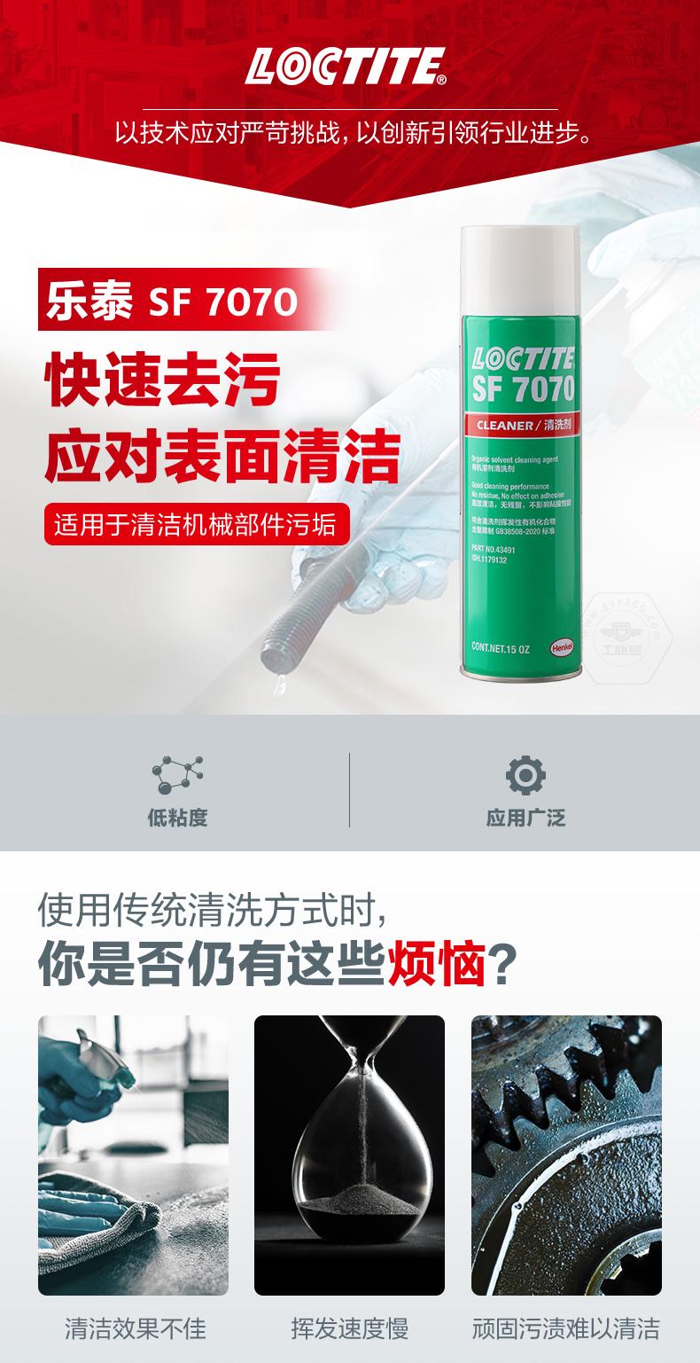 乐泰SF7070是一种无色透明溶剂型(不含氟氯烃的)部件清洗剂和脱脂剂,它经过特别配制,可使部件与胶粘剂粘合。该产品适合在室温下用做喷剂,能去除部件上的大部分油、油脂、润滑液、金属切削液和细粉,可安全用于铝、橡胶和大多数塑料。