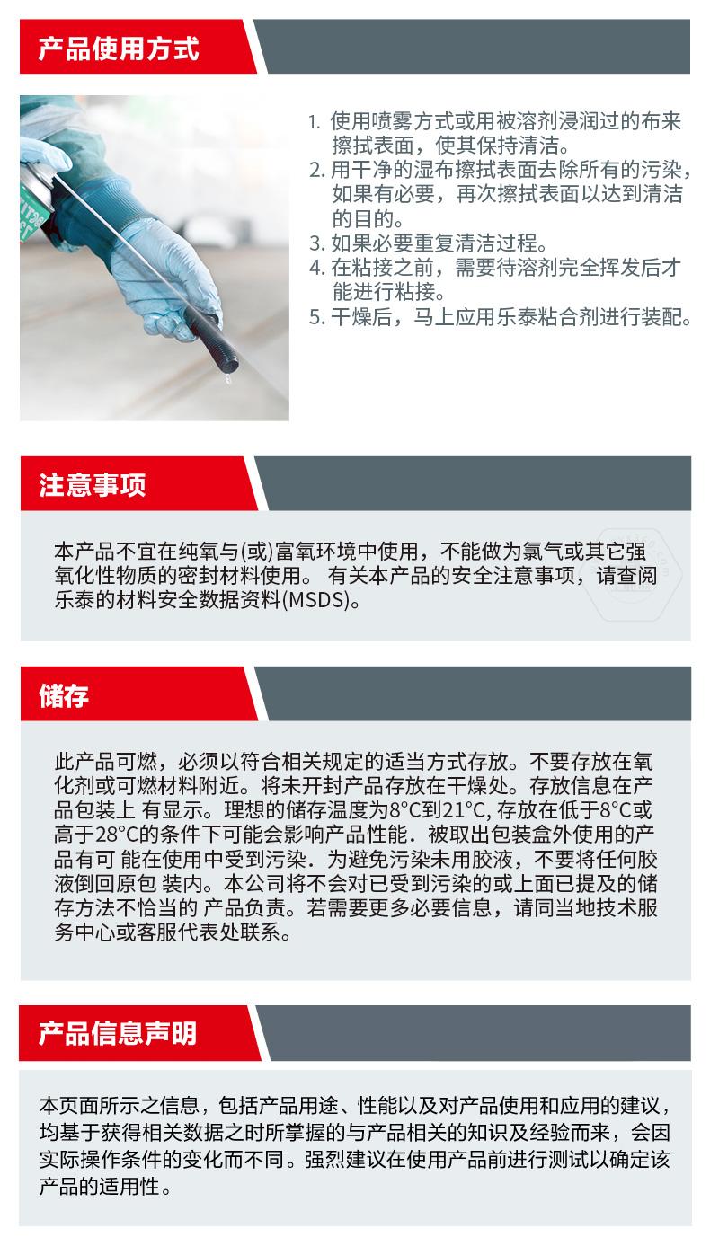 乐泰SF7070是一款溶剂型清洗剂。乐泰SF7070主打快速去污,适用于表面清洁和机械部件污垢清洗。乐泰SF7070无色透明,化学类型为碳氢化合物,20℃下干燥时间为5-20分钟,粘度非常低。乐泰SF7070具备快速挥发、应用广泛、强效清洁等特点,可用于装配前的最终清洁处理。乐泰SF7070还与金属、多种塑料和弹性体兼容。