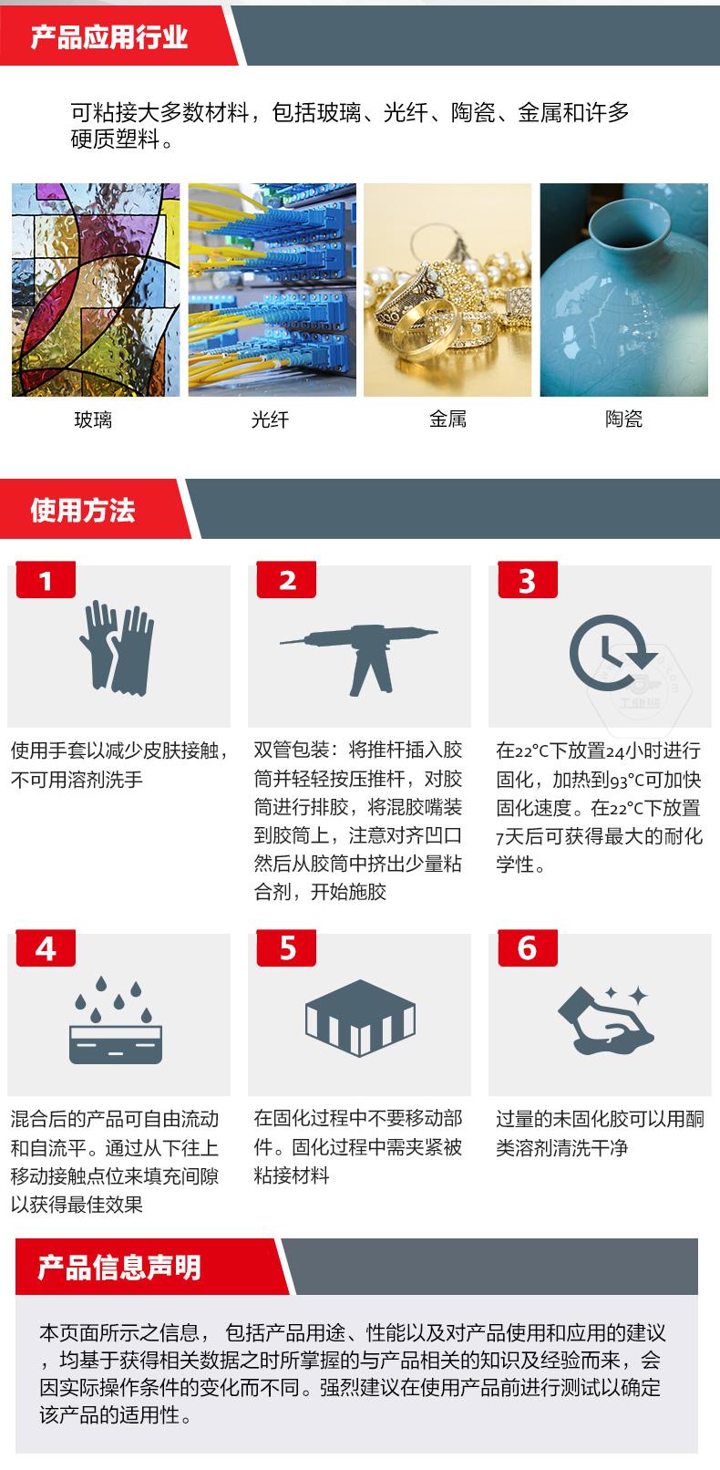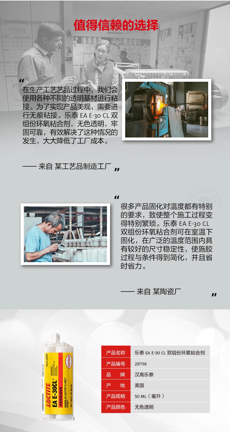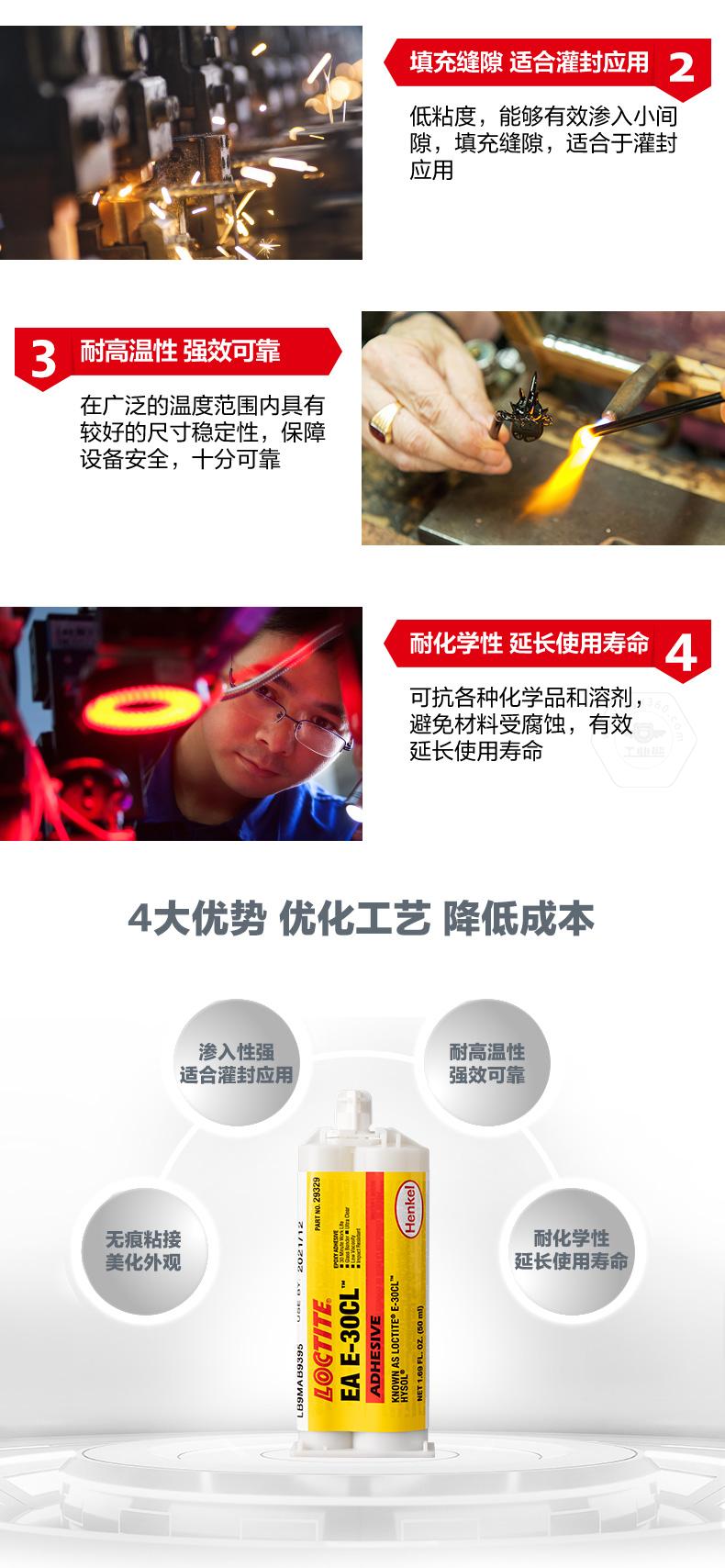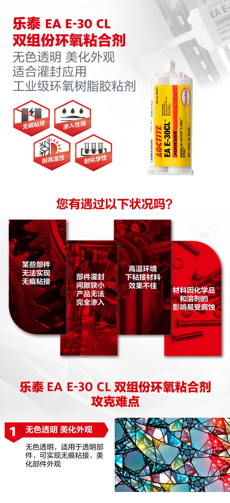 乐泰EA E-30 CL双组份环氧粘合剂是一款无色透明的工业级环氧树脂胶粘剂。乐泰EA E-30 CL双组份环氧粘合剂适用于透明部件,可实现无痕粘接,美化外观。乐泰EA E-30 CL双组份环氧粘合剂低粘度、渗入性强,能够有效渗入小间隙并填充缝隙,适合灌封应用。乐泰EA E-30 CL双组份环氧粘合剂还具备耐高温性和耐化学性,可用于玻璃、光纤、陶瓷、金属和许多硬质塑料的粘接。