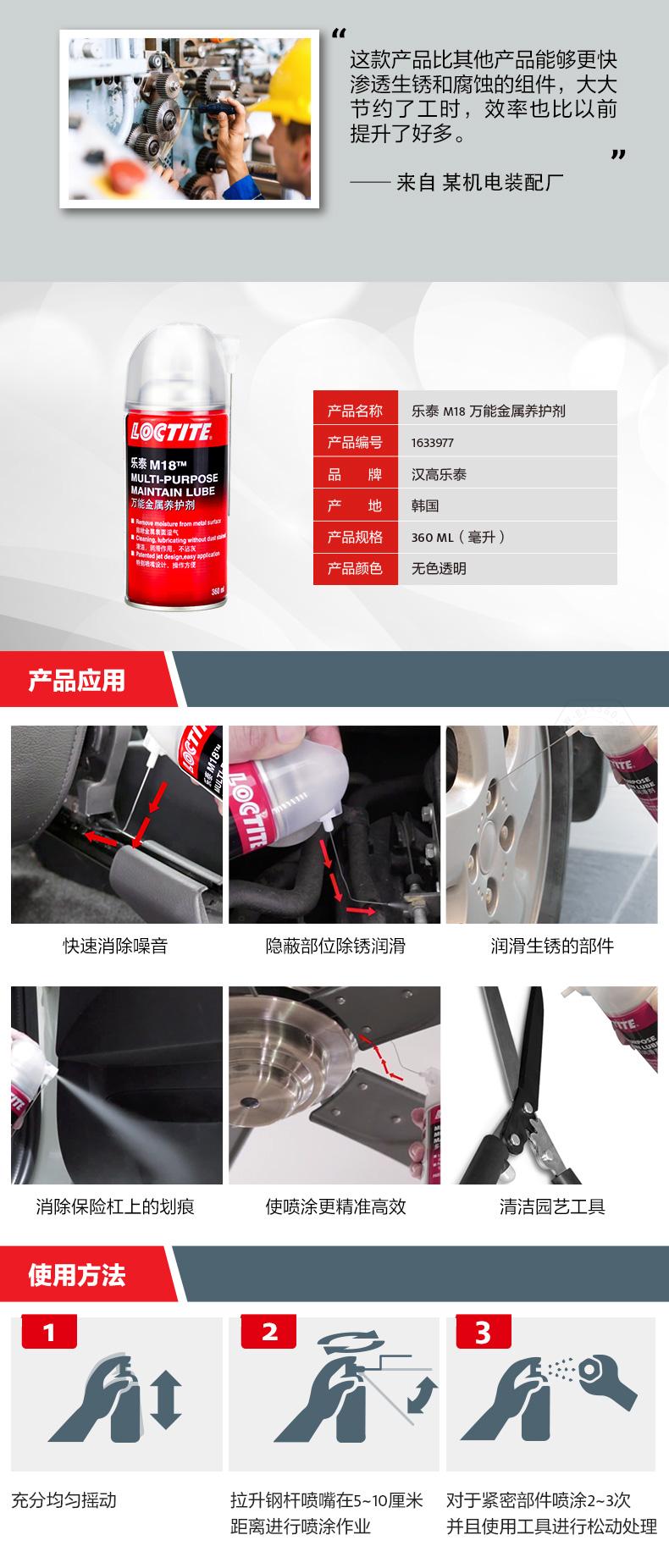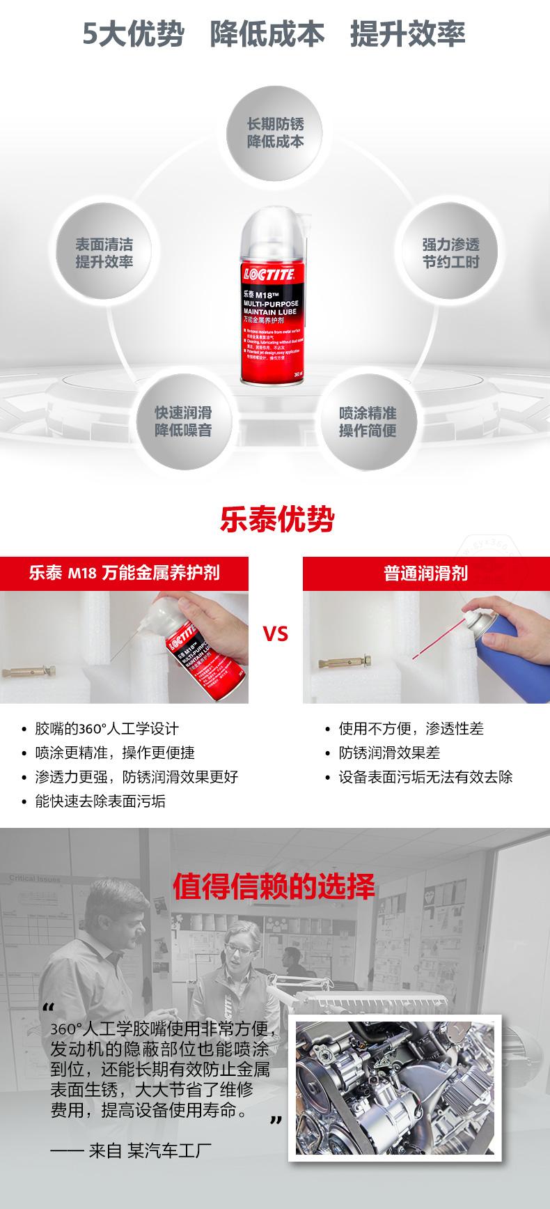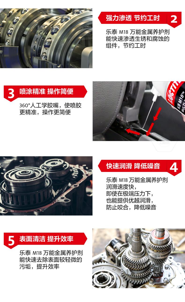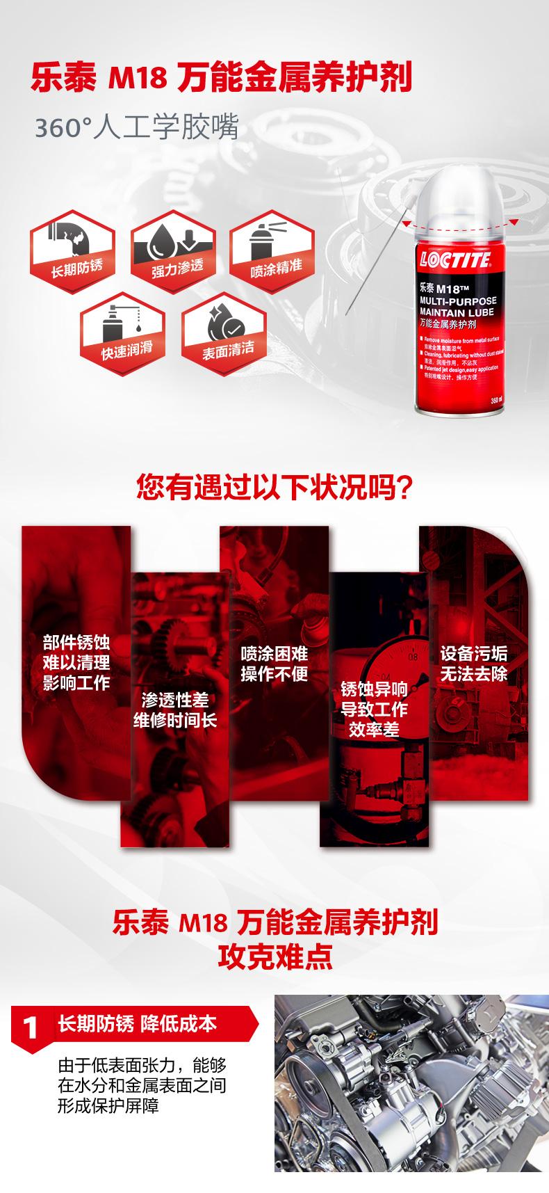 乐泰M18万能金属养护剂是一款集防锈、渗透、润滑、清洁于一体的产品。乐泰M18万能金属养护剂由于低表面张力,能够在水分和金属表面之间形成保护屏障,实现长期防锈。乐泰M18万能金属养护剂可快速渗透生锈和腐蚀组件,节约工时。乐泰M18万能金属养护剂采用360°人工学胶嘴,喷涂更精准,操作更简便,还可快速润滑并降低噪音,同时去除表面较轻微污垢,提升效率。